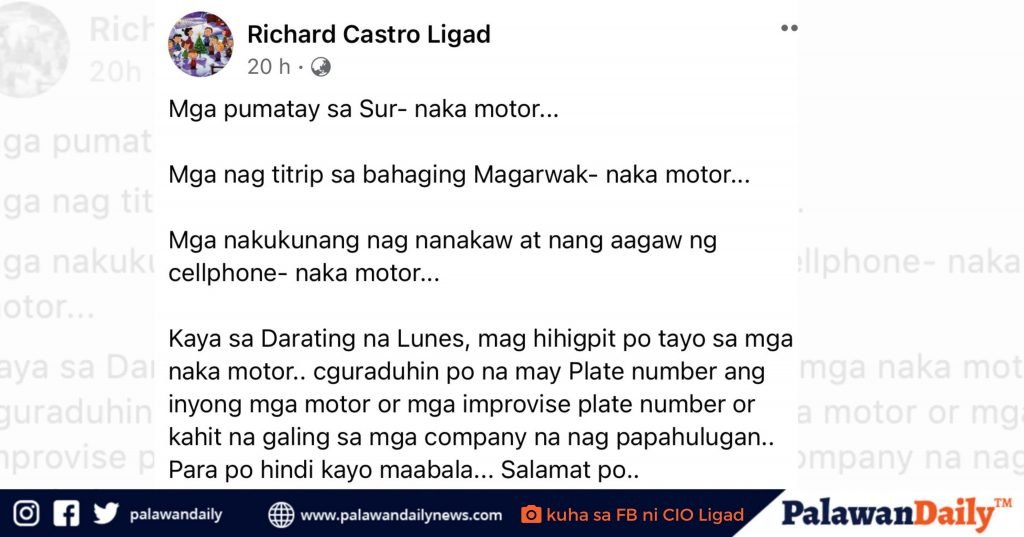 Sa pagpupulong ng Peace and Order Council Meeting kahapon, iniatas na rin umano ni Mayor Lucilo Bayron na busisiing mabuti ang lahat ng mga papasok ng motor na galing sa mga munisipyo ng Lalawigan ng Palawan na walang plate number.