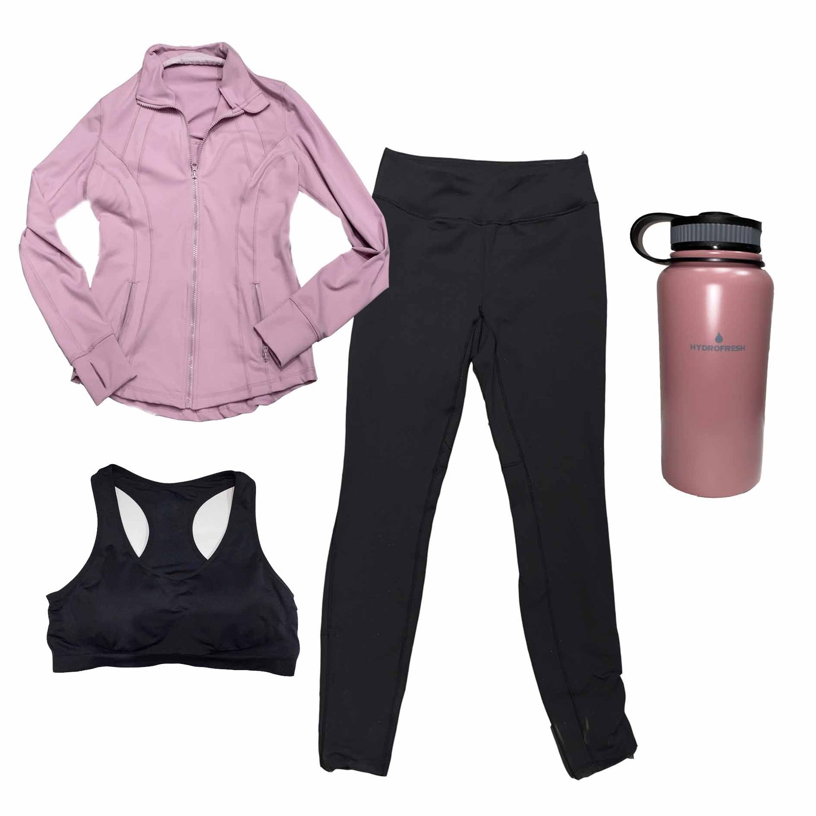 Add a pop of color to your usual black sports bra and black leggings with a workout jacket and tumbler in dusty rose.