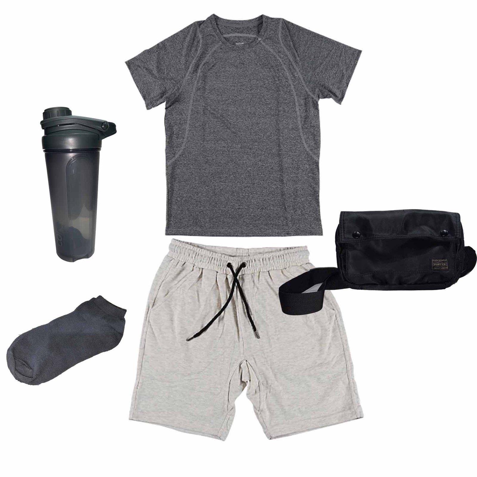 Head for the gym in a monochromatic look with a shaker bottle for your protein fix and a messenger bag for your important things.