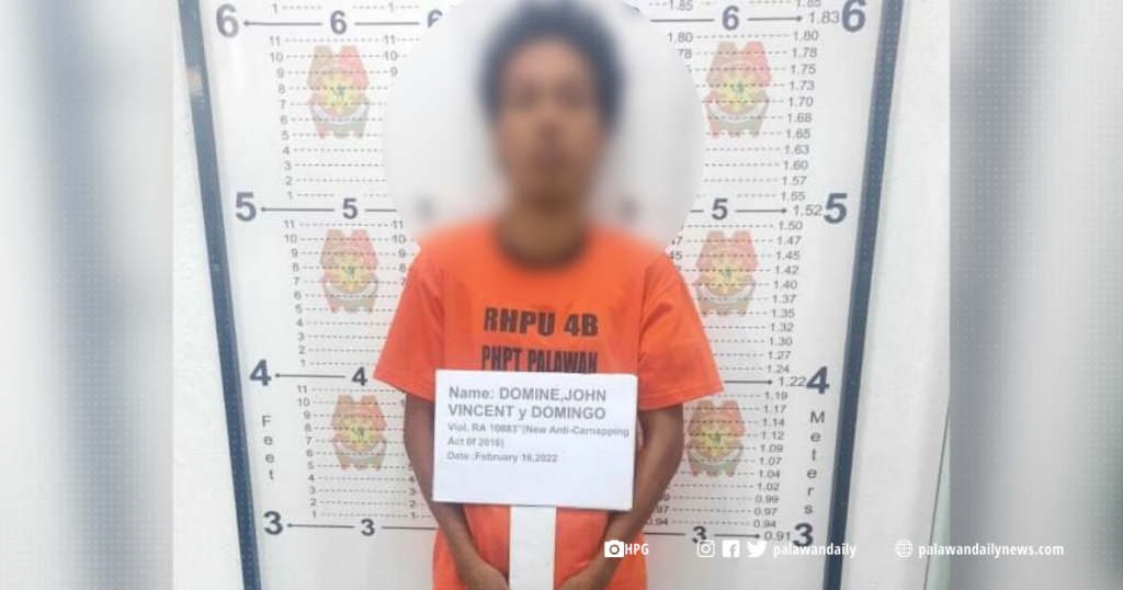 Hindi na nakapalag ang isang 21 anyos na si John Vincent Domingo Domine nang maaresto ito sa ginawang entrapment operation ng PNP highway patrol group Palawan at Bataraza Municipal Police Station sa bahagi ng National Highway ng Barangay Sicsican sa lungsod ng Puerto Princesa noong February 16, 2022.