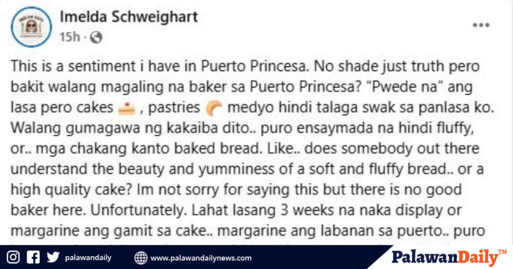 Former Miss Philippines Earth Imelda Schweighart drew public attention this week after posting a critique of cakes sold in Puerto Princesa, describing them as subpar and lacking in quality.
